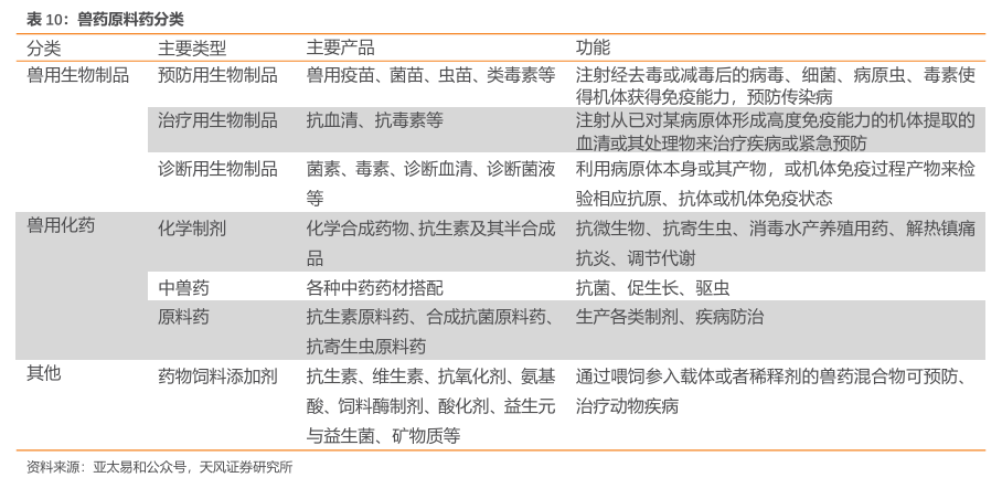 兽药是用于预防、治疗、诊断畜禽等动物疾病,有目的地调节其生理机能的物质(含饲料药物添加剂)。按照兽药成份分类可以将兽药分为兽用生物制品、兽用化学制剂和饲料添加剂等其他三类。兽用生物制品是指根据免疫学原理,利用微生物、寄生虫及其代谢产物或免疫应答产物制备的一类物质,包括预防用、治疗用和诊断用生物制品;兽用化药,参考《兽药产业发展协会》划分标准包括化学制剂、中兽药和原料药,可用于疾病防治、促生长、防虫等;其他主要包括饲料添加剂,通过混合饲料达到疾病防治、促生长等作用。