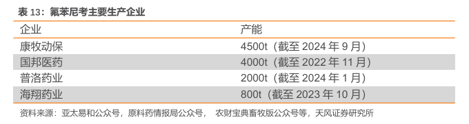 氟苯尼考供大于求。截至2023年11月,氟苯尼考整体产能约1.8w吨,康牧动保及国邦药业产能分别为4500t及4000t。市场整体需求大概在6500吨左右(其中国内4000吨),国外出口2500吨,产能严重过剩。