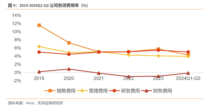 费用端大幅优化,体现良好管理能力及稳健经营风格。公司整体费用率从2019年的23.1%降至2024Q3的13.1%,费用端大幅优化,主要系销售费用率从2019年的11.6%降至2024Q3的4.3%。此外,管理费用率和财务费用率分别由2019年的6.4%和0.2%下降至2024Q3的3.9%和-0.2%。利息收入带动公司财务费用率自2021年起持续低于0%。考虑到公司控费持续推进,未来有望带动利润加速增长。
