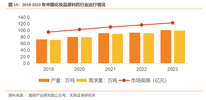 化妆品原料指应用于化妆品中的具有保湿、滋润、抗衰老、抗氧化、美白等功能的天然、合成或者提取的各种物质。智研咨询数据显示2023年我国化妆品原料行业市场规模约为122.65 亿元,产量约为101.7万吨,需求量约为99.6万吨。我国化妆品原料市场起步相对较晚,外国企业占据大部分市场份额。目前氨基酸、烟酰胺、果酸、肽类、玻色因、视黄醇、表面活性剂、防晒剂等热门原料大部分依赖进口,基本上被全球各大化妆品集团,以及巴斯夫、德之馨、道康宁等国际原料巨头所垄断。