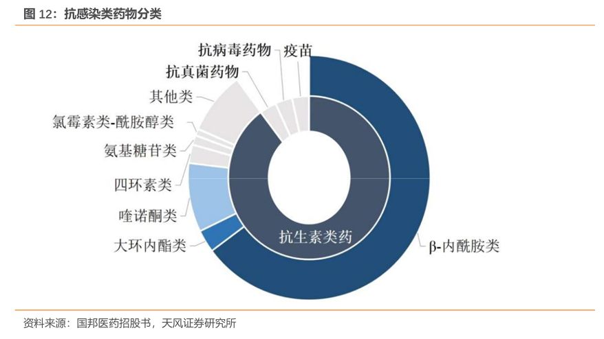 抗生素为最大的抗感染药物类别,占整个抗感染药物的90%左右。依据其化学结构及抑菌机理的不同,抗生素可分为β-内酰胺类抗生素、氨基糖甙类抗生素、四环素类抗生素、喹诺酮类抗生素、酰胺醇类抗生素、大环内脂类抗生素等大类。目前以头孢菌素和青霉素为主的β-内酰胺类抗生素约占世界抗生素市场的70%。