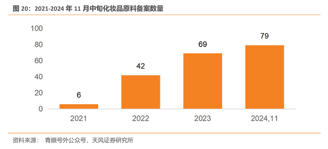 化妆品原料药布局热度持续攀升。中国药品监督管理局数据显示,自2021年《化妆品监督管理条例》正式实施以来,化妆品新原料数量连年增加。2021年仅有6款新原料获得备案编号,2023年攀升至69项,呈现出较为明显的逐年递增态势。截至 2024 年 11 月中旬,2024年化妆品新原料成功备案的数量已达 79 个,企业在化妆品新原料的布局热度持续攀升。