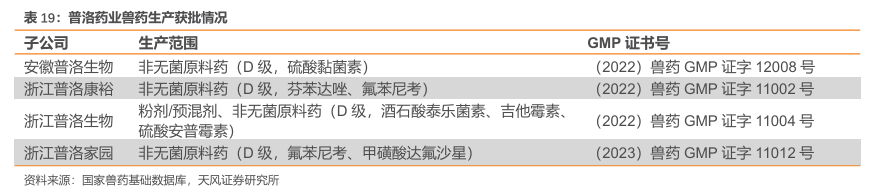依托兽用原料药生产,布局兽药CDMO,形成差异化竞争力。公司在兽药研发、注册、生产上经验丰富。兽药原料药主要是抗生素主流品种,应用于动物养殖和保健。公司具备兽药生产资质的子公司共4家,多类产品如氟苯尼考、酒石酸泰乐菌素、芬苯达唑等已获批准。公司大力开拓公司兽药CDMO市场,截至2023年10月,CDMO业务的兽药占比大概在30%左右,CDMO板块的兽药业务受益于原材料价格下降。公司积累项目储备和客户资源,普洛药业先后与全球前五大兽药巨头企业(硕腾、BI动保、Merck动保、礼蓝Blanco、爱德士IDEXX)开展业务。