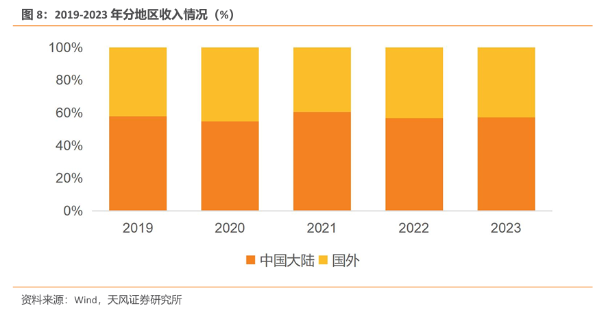 海外市场逐步拓展,国外业务增长迅速。公司加快推进深度国际化战略步伐,营销网络覆盖北美洲、欧洲、亚洲、南美洲、非洲以及国内各大中型城市,产品运销 70余个国家和地区。国外业务从2019年的30.29亿元增长至2023年的49.19亿元,增长显著。