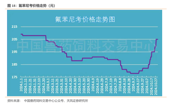氟苯尼考价格提升,市场关注度高。中国兽药饲料交易中心数据数显示,2024年10月30日,氟苯尼考市场均价为205元/千克,环比上涨5.13%,均价突破200大关,逼近年初高点。截至12月上旬,价格维持在204.05元/千克左右,价格回升至200元/千克以上后整体维持平稳运行,整体处于整理区间。