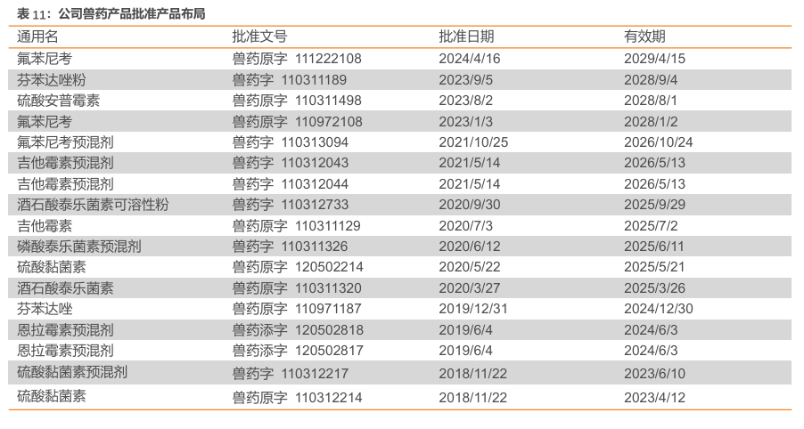 产能充足,部分品种有扩产计划。产能端,公司硫酸粘菌素产能由3300吨削减至2000吨,恩拉霉素原粉及预混由4255吨削减至2200吨,氟苯尼考2000吨。2024年初,公司开展年产3500吨抑菌类医药原料(AH22081)项目,即酶法生产的D-对甲砜基苯丝氨酸,为氟苯尼考的中间体。