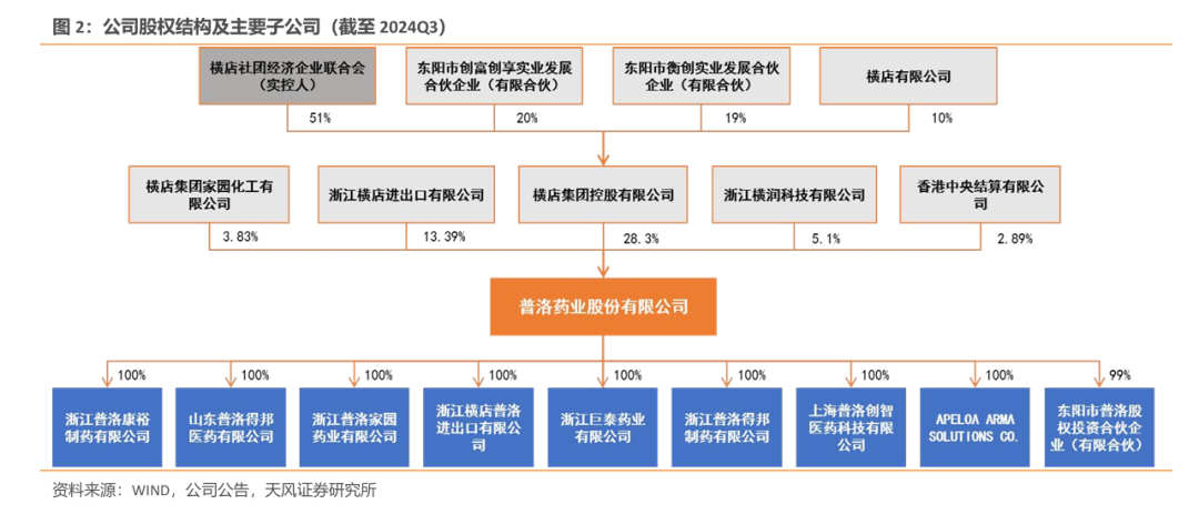 股权结构稳定,下属公司有序分工。公司控股股东为横店集团控股有限公司,持股28.3%,公司实际控制人为东阳市横店社团经济企业联合会。股权结构稳定。下属公司有序分工。公司下属浙江普洛康裕制药有限公司等11家全资及控股子公司。