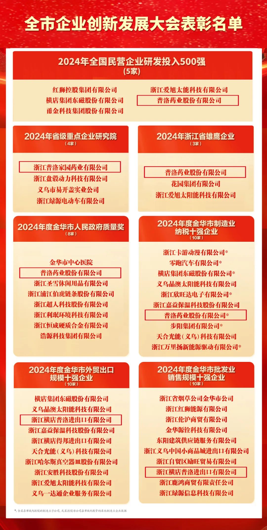 昨日(2月10日)下午,金华市企业创新发展大会在市文化中心隆重召开。为进一步推动金华市企业加大创新力度,本次大会对在经营业绩与创新发展领域取得显著成就的企业进行了表彰。会上,普洛药业再度蝉联“金华市制造业纳税十强企业”,并成功跻身多个重要榜单。公司共计荣获7项殊荣,充分展现了其持续的创新活力和强大的综合实力。