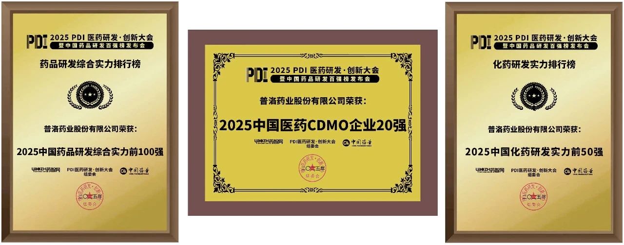 6月20日,由药智网等单位主办的“2025 PDI医药研发·创新大会暨中国医药研发百强榜发布会”于重庆盛大举行,并发布《2025中国药品研发实力排行榜》系列榜单。普洛药业再度荣登《2025中国药品研发综合实力TOP100》《2025中国CDMO企业TOP20》以及《2025中国化药研发实力TOP50》三大榜单。其中,公司化药研发实力排名提升至第44位,相较去年大幅跃升29位,且连续第六年稳居中国医药CDMO企业前五之列。