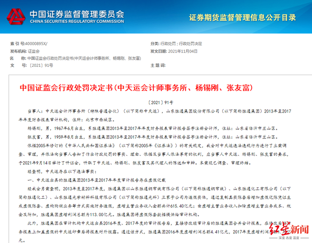 红星资本局11月17日获悉,证监会官网日前发布了一份行政处罚决定书,对中天运出具的胜通集团2013年至2017年年度审计报告存在虚假记载的违法事实进行了处罚。