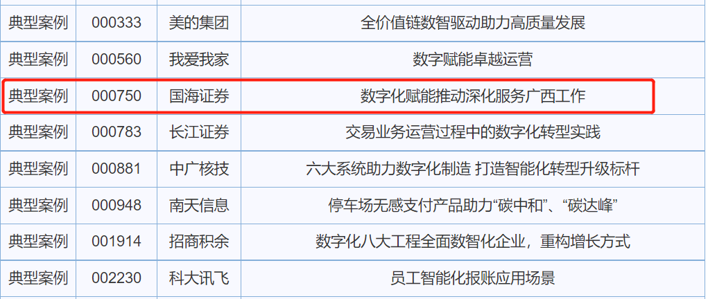 近日,由中国上市公司协会组织的2021年上市公司数字化转型典型案例征集活动结果揭晓,国海证券《数字化赋能推动深化服务广西工作》案例成功入选《中国上市公司数字化转型典型案例》。