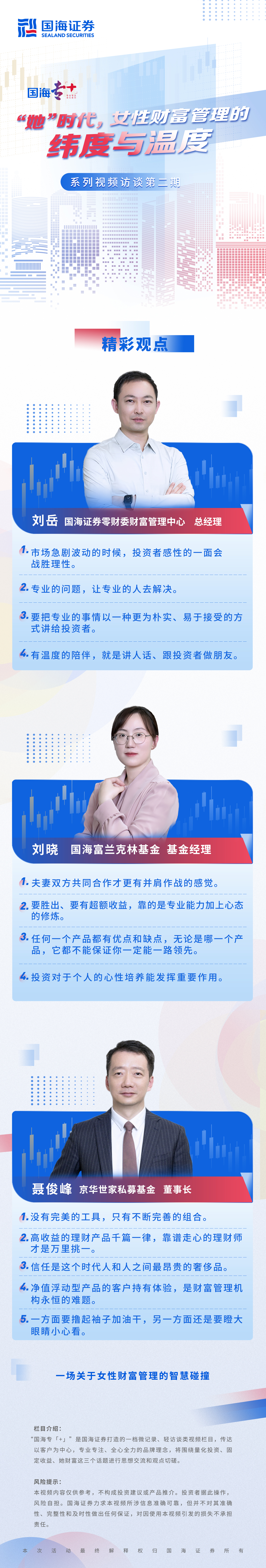 聚焦「她」时代的财富管理,助力智慧女性硬核修炼,国海专「+」第二期来啦!国海证券零财委财富管理中心总经理刘岳、国海富兰克林基金经理刘晓、京华世家私募基金董事长聂俊峰展开智慧对话,全方位解读女性财富管理的纬度与温度、修炼与进阶!