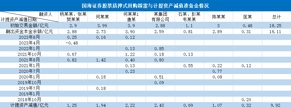 具体来看,国海证券在与杨某某、张某、樊某某的股票质押式回购业务上已累计计提资产减值准备1.25亿元,与何某某的质押式回购业务上已计提资产减值准备1.94亿元,与何某某1、唐某的质押式回购业务上已计提资产减值2.22亿元,与某集团有限公司的质押式回购业务上已计提资产减值2.43亿元,与石某、彭某、韦某某的质押式回购业务上已计提资产减值0.69亿元,与陈某某的质押式回购业务上已计提资产减值1.07亿元,与匡某的质押式回购业务上已计提资产减值0.32亿元。