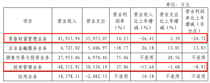 然而,凤凰网财经《投资观察》注意到,国海证券零售财富管理、大资管业务表现却并不理想。其中,零售财富管理业务(包括证券经纪业务、期货经纪业务、代理销售金融产品业务)实现营业收入4.19亿元,同比下降26.41%。投资管理业务(大资管业务,包括资管业务、公募基金管理业务、私募基金管理业务)实现营业收入4.85亿元,同比下降15.6%。
