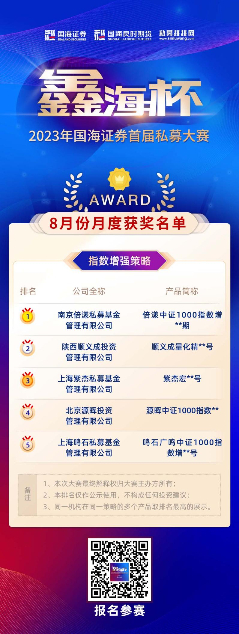南京倍漾私募基金管理有限公司综合实力强劲,表现优异,旗下的“倍漾中证1000指数增**期”还夺得了8月月度奖指数增强策略组的冠军。