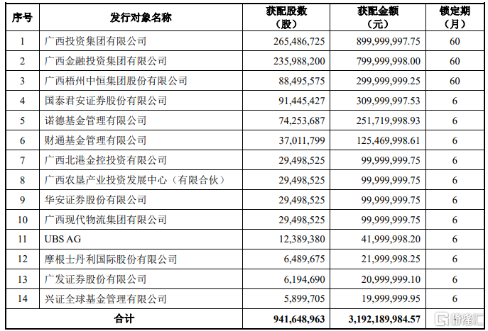 格隆汇11月15日丨国海证券(000750.SZ)公布向特定对象发行A股股票上市公告书,确定本次发行价格为3.39元/股,发行股数为9.42亿股,募集资金总额约为31.92亿元。本次发行对象最终确定为14家,具体配售结果如下: