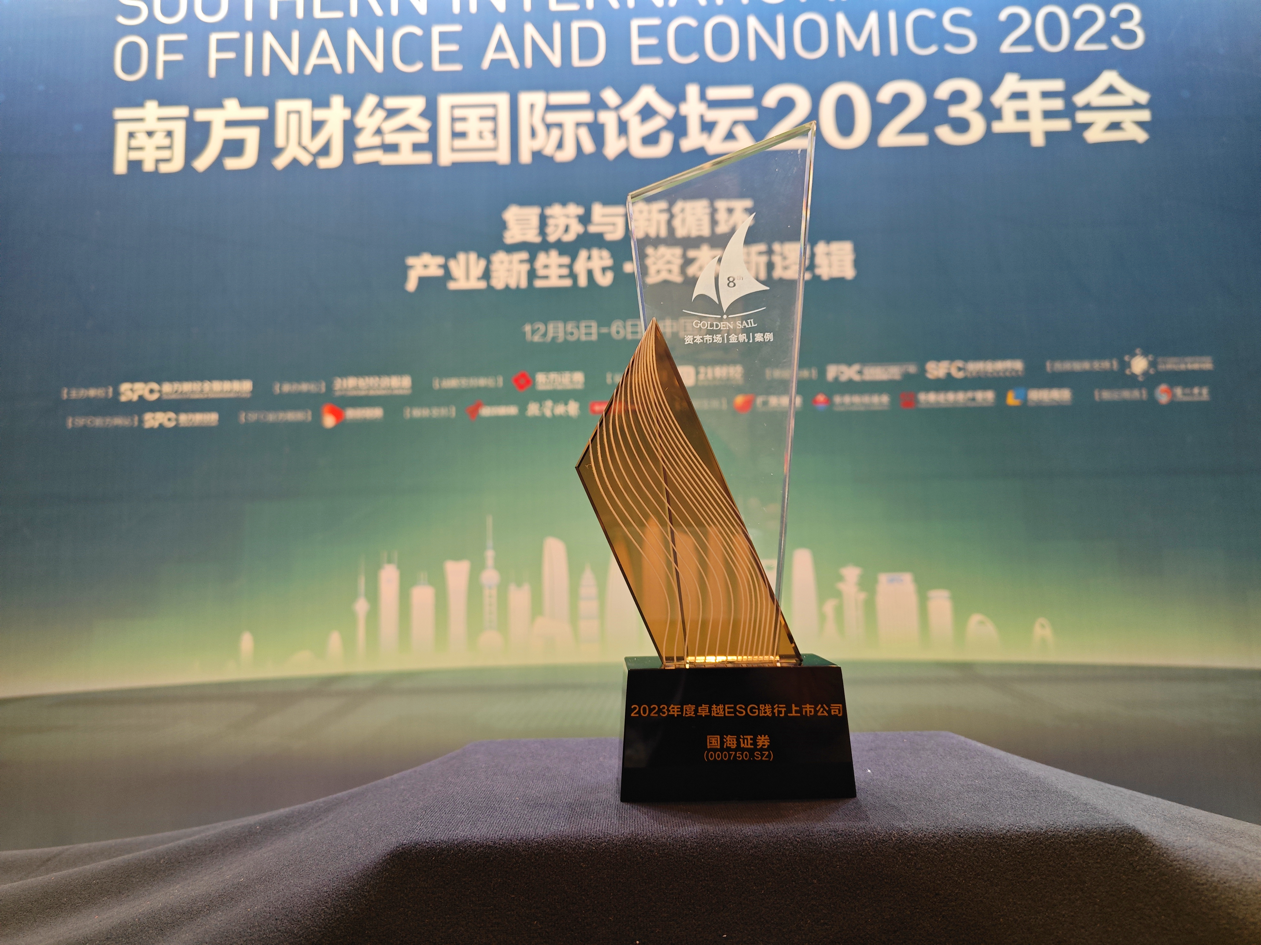 12月6日,“2023南方财经国际论坛暨财经金帆奖颁奖典礼”在广州举行。国海证券以优异的综合表现从多家参评券商中脱颖而出,荣获“2023 年度卓越ESG践行上市公司”金帆奖。