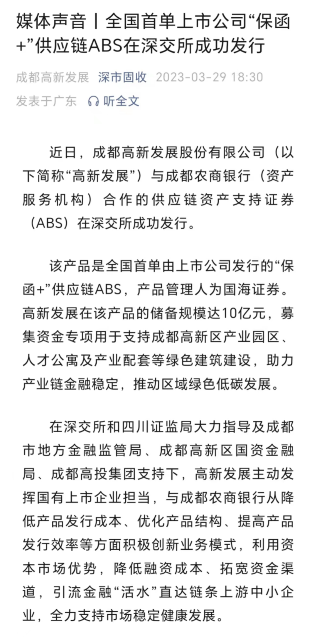 国海证券发行全国首单上市公司“保函+”供应链ABS