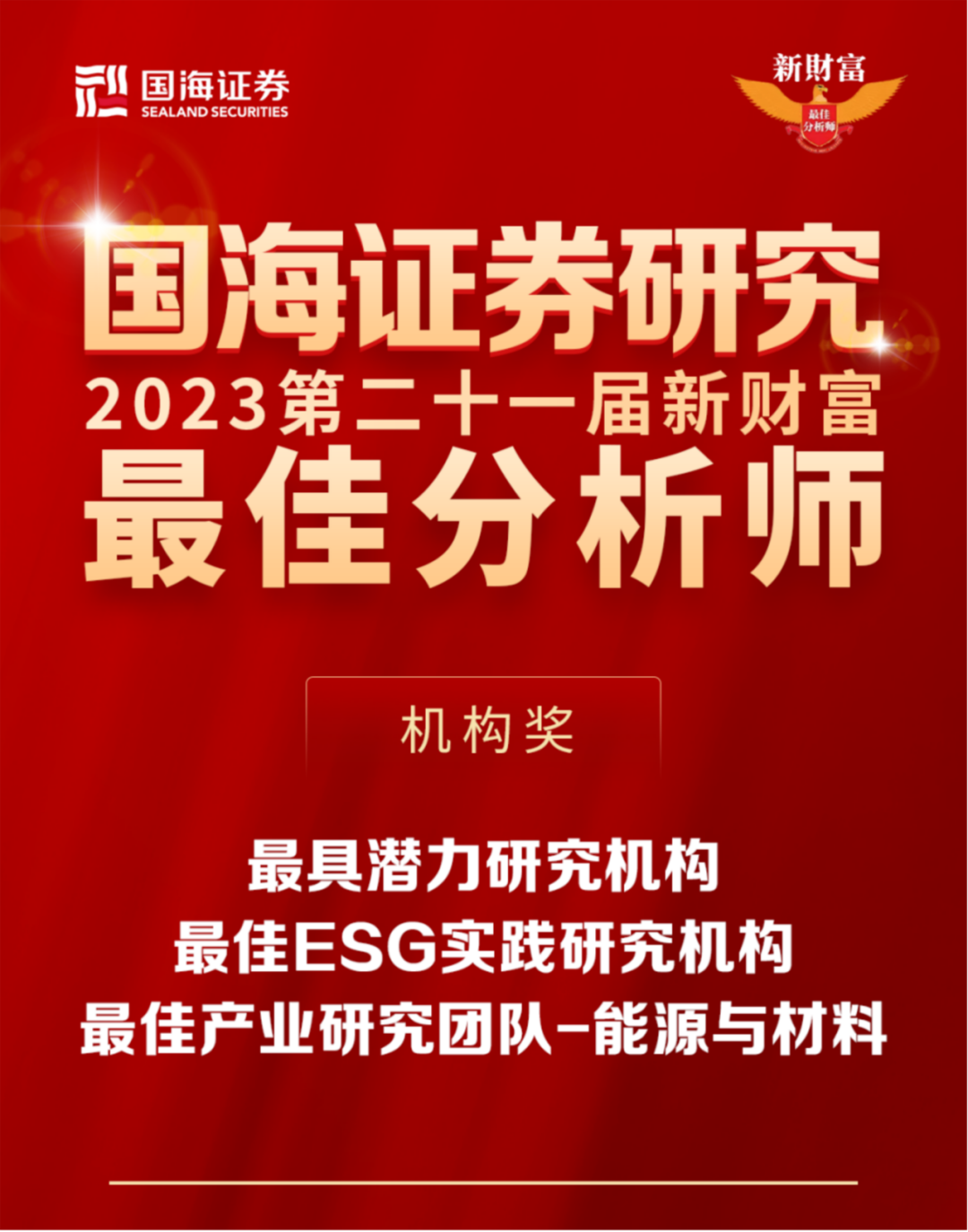 2023年,公司研究所发展迅猛,在多个奖项评选中斩获大奖。第二十一届新财富最佳分析师评选中,获得“最具潜力研究机构”“最佳ESG实践研究机构”“最佳产业研究团队(能源与材料)”3个团体奖项,海外研究小组、化工研究小组均获最佳分析师第3名。第五届新浪财经金麒麟最佳分析师评选中,获得最具特色研究机构第8名,传媒、公用、电池、医药、金工、高端制造六个小组均获奖。第三届21世纪金牌分析师评选中,获得“2023年度服务地方经济高质量发展最佳机构”奖,化工、海外、食饮、能源四个小组均获奖。第十一届万得金牌分析师评选中,基础化工、交通运输、食品饮料均位列前三名。秉承“一年一台阶,三年大跃升”的信念,国海证券研究所将继续努力做好研究与服务,不忘初心,行稳致远。