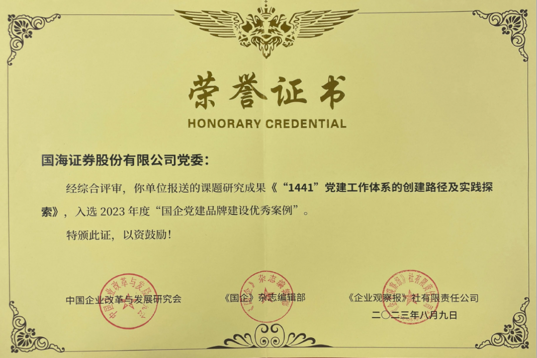公司党委印发《国海证券股份有限公司基层党建高质量发展三年行动计划(2023-2025年)》,着力实施5大行动、14项重点任务、6大专项工作,并同步发布了公司党委党建工作品牌2.0版本——国之大者·证海先锋以及国海证券“1441”党建工作体系。《“1441”党建工作体系的创建路径及实践探索》荣获2023年度“国企党建品牌建设优秀案例”,混合所有制金融企业党建工作的体系化、品牌化水平进一步提升。