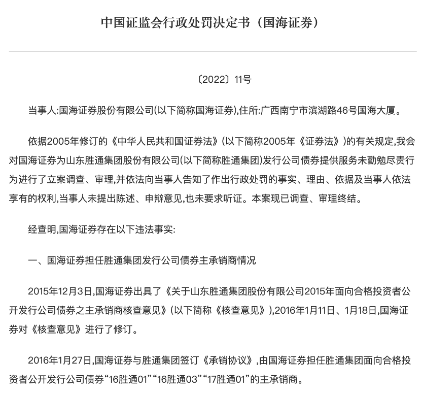 2022年3月18日,证监会对国海证券出具了行政处罚决定书,陈述了国海证券在“胜通债”案中的一系列违法事实,没收国海证券1798万元的承销费用并处以60万元罚款。