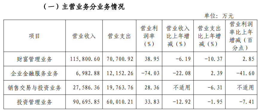 分部数据显示,财富管理条线营业收入11.58亿元,同比下降6.19%;因营业成本下降较大,营业利润为4.51亿元;毛利率增加2.85个百分点,达到38.95%。企业金融服务条线营业收入为0.70亿元,同比下降22.08%;营业利润为-0.52亿元。但营业支出高达1.2152亿元,导致毛利率同比下降41.6个百分点,降至-74.03%。销售交易与投资业务条线的营业收入由负转正,2023年创收2.76亿元;营业利润为0.78亿元,毛利率达到28.36%,显示出较强的盈利能力。投资管理业务条线,营业收入下降12.92%,创收9.07亿元;营业利润为3.07亿元,毛利率为33.83%,同比下降7.41个百分点。