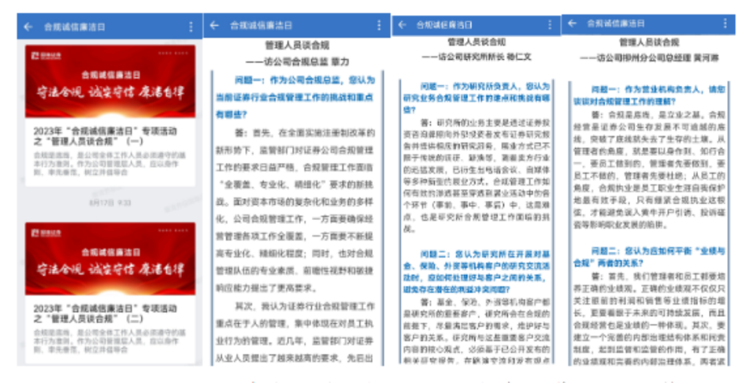 公司自2021年起将7月27日定为“合规诚信廉洁日”,每年开展形式多样的宣导培训活动。2023年,公司以“守法合规诚实守信廉洁自律”为主题,在7月-9月期间组织全体员工开展“合规诚信廉洁日”专项活动。组织开展全体员工学习新规并进行专题考试、通报违规典型案例、“管理人员谈合规”、一线人员风采展示等丰富多彩的活动,提升全体员工合规、诚信、廉洁从业意识。