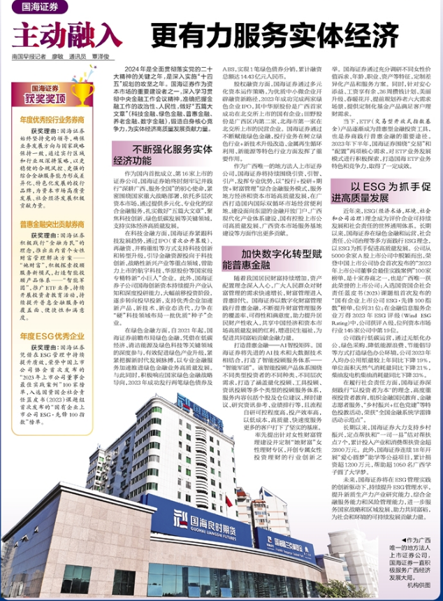 在这一官媒报道发布前一天,base南宁的南国早报,揭晓了第八届广西金融服务百姓口碑榜。作为入榜的唯一家券商,整版报道国海证券揽获“年度优秀投行业务券商”“普惠金融突出贡献机构”“年度ESG优秀企业”三项大奖。