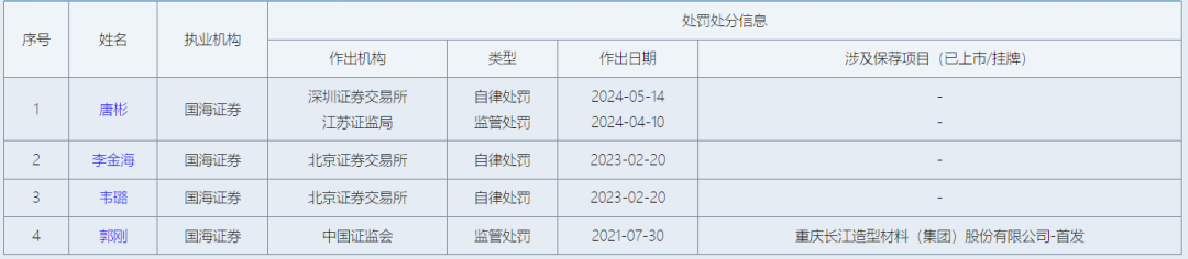 履历显示,唐彬早年任职于国泰君安证券。他于2007年加入国海证券,2012年10月取得保代资质,在国海证券,他累计签署7单项目。因“金通灵案”,这位资深保代名下有2条”违法失信”记录。