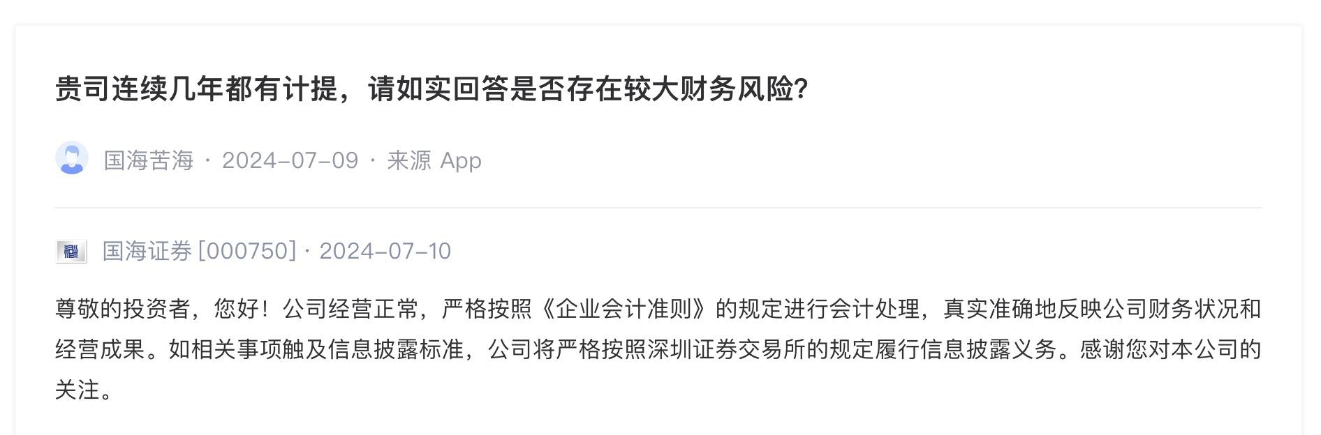 蓝鲸新闻注意到,此前有投资者在互动平台向国海证券提问,“公司连续几年都有计提,是否存在较大财务风险?”。
