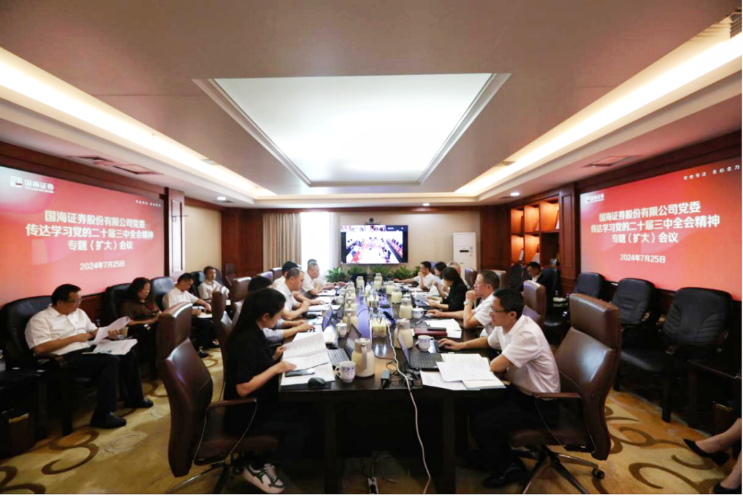 7月25日,国海证券召开党委(扩大)会议,传达学习贯彻党的二十届三中全会精神,研究公司贯彻落实措施。公司党委书记、董事长何春梅主持会议并讲话。