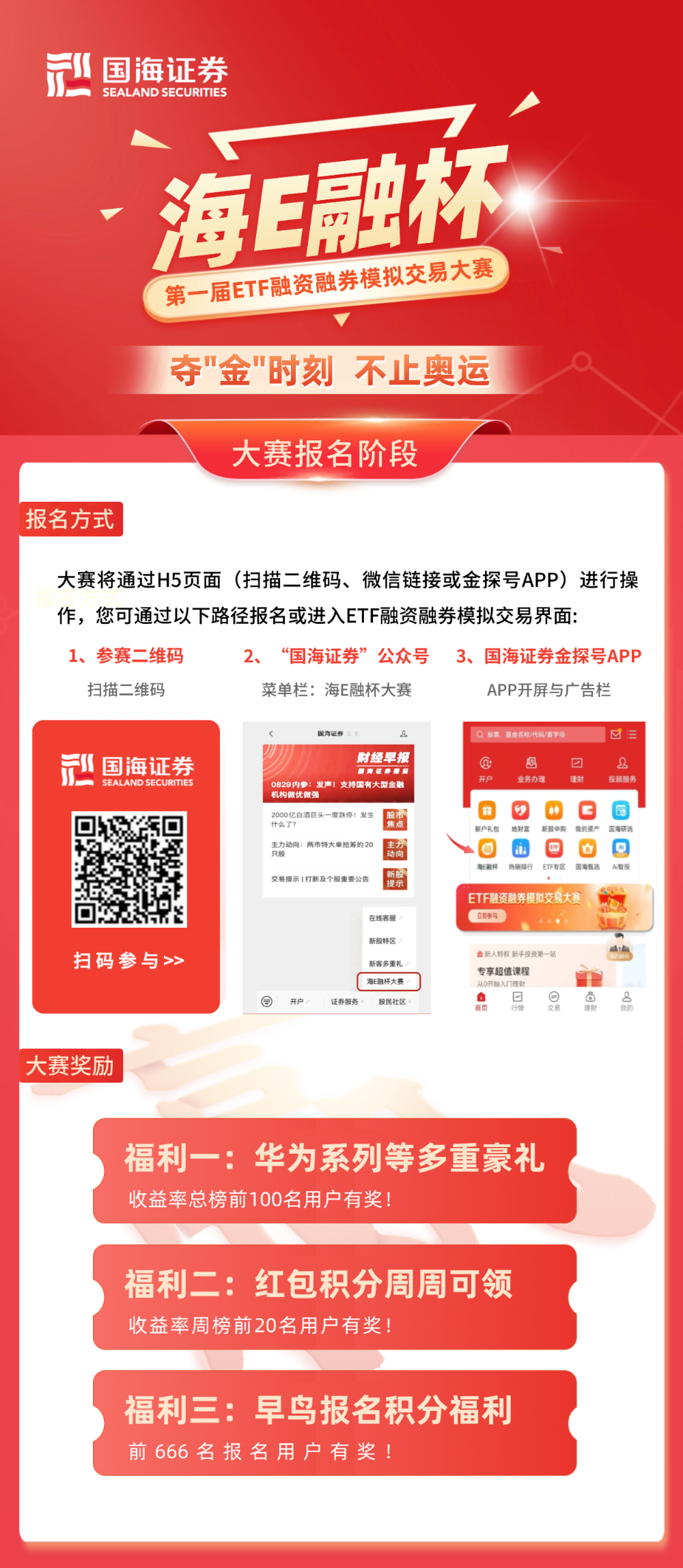 大赛期间,国海证券联合多家基金公司提供专业支持。大赛是以两融+ETF为投资手段、模拟盘竞技为核心的投资者教育创新活动,通过3个月的模拟交易竞赛,使投资者在比赛过程熟悉使用融资融券工具,结合ETF的沉浸式投资体验,助力广大投资者探索两融工具和ETF的投资价值,优化投资组合的获利稳定性,进而培育成熟的风险控制与投资配置理念。