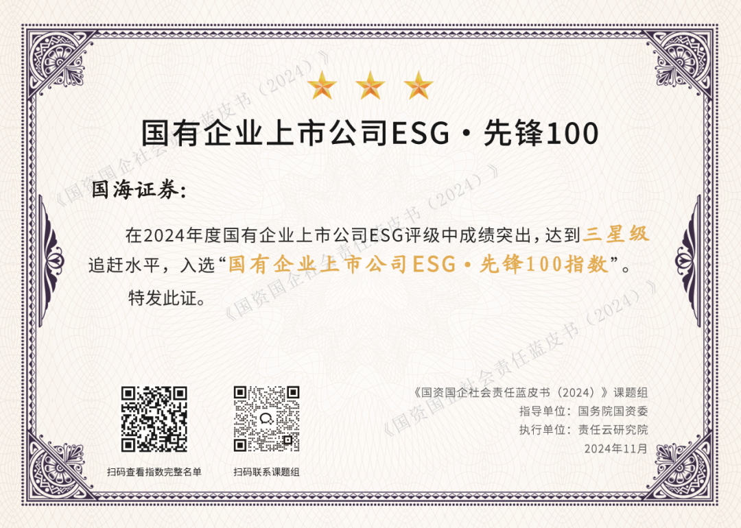 11月7日,国海证券连续两年入选国资国企社会责任蓝皮书(2024)课题组发布的“国有企业上市公司ESG·先锋100指数”榜单。