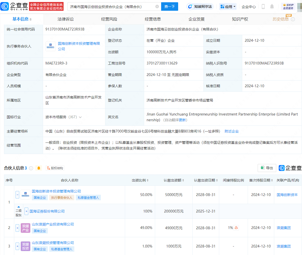 近日,济南市国海云创创业投资合伙企业(有限合伙)成立,出资额10亿元人民币,经营范围包含:创业投资(限投资未上市企业);以私募基金从事股权投资、投资管理、资产管理等活动。股权穿透显示,该合伙企业由国海证券(000750)旗下国海创新资本投资管理有限公司,及山东浪潮产业投资有限公司、山东浪潮投资管理有限公司共同持股。