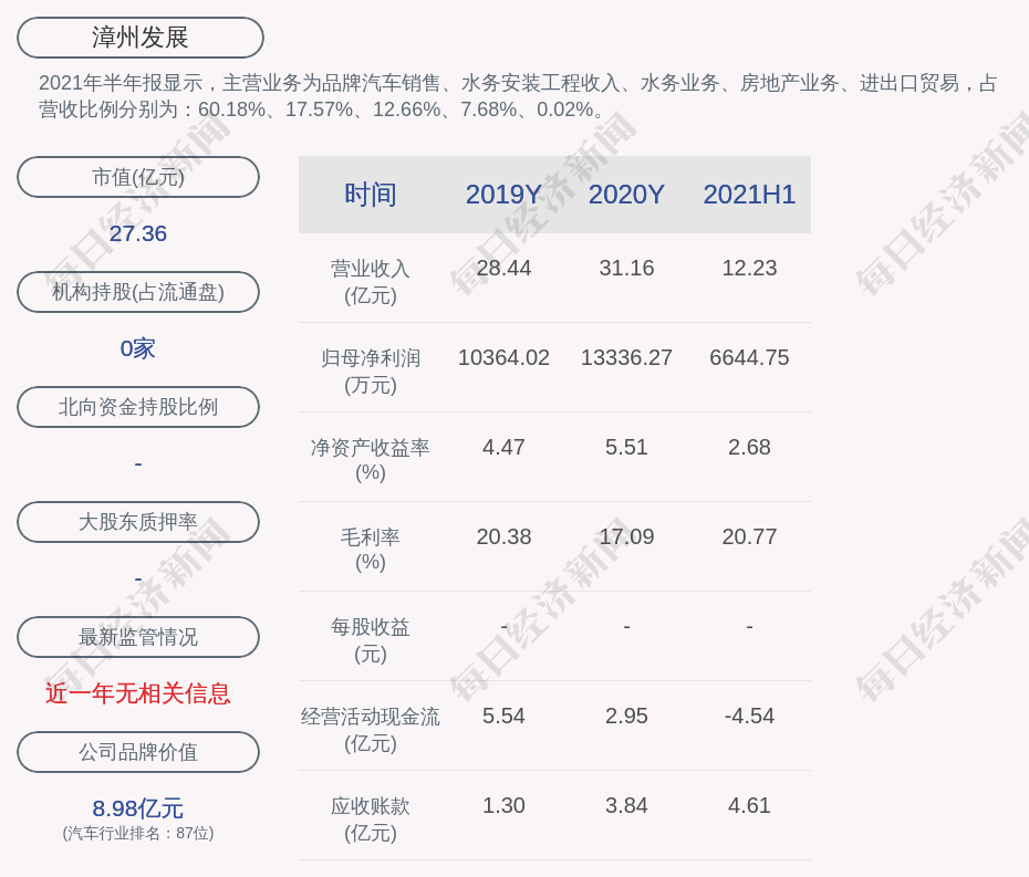 2021年半年报显示,漳州发展的主营业务为品牌汽车销售、水务安装工程收入、水务业务、房地产业务、进出口贸易,占营收比例分别为:60.18%、17.57%、12.66%、7.68%、0.02%。