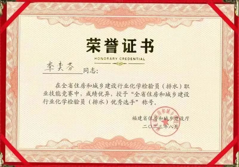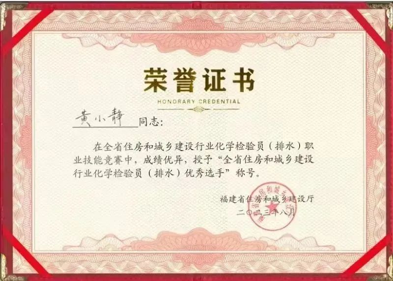 近日,由福建省住房和城乡建设厅、福建省总工会联合主办的“全省住建系统化学检验员(排水)职工岗位技能竞赛”圆满落幕。福建漳州发展股份有限公司权属企业漳发生态科技有限公司漳州龙文东墩分公司黄小静、李奕芬两名选手通过层层选拔,脱颖而出,作为漳州代表队成员参加竞赛。历经两天半的精彩角逐,两位“巾帼女将”,勇挑大梁,以优异成绩荣获“团体三等奖”,被授予“全省住房和城乡建设行业化学检验员(排水)优秀选手”荣誉称号。