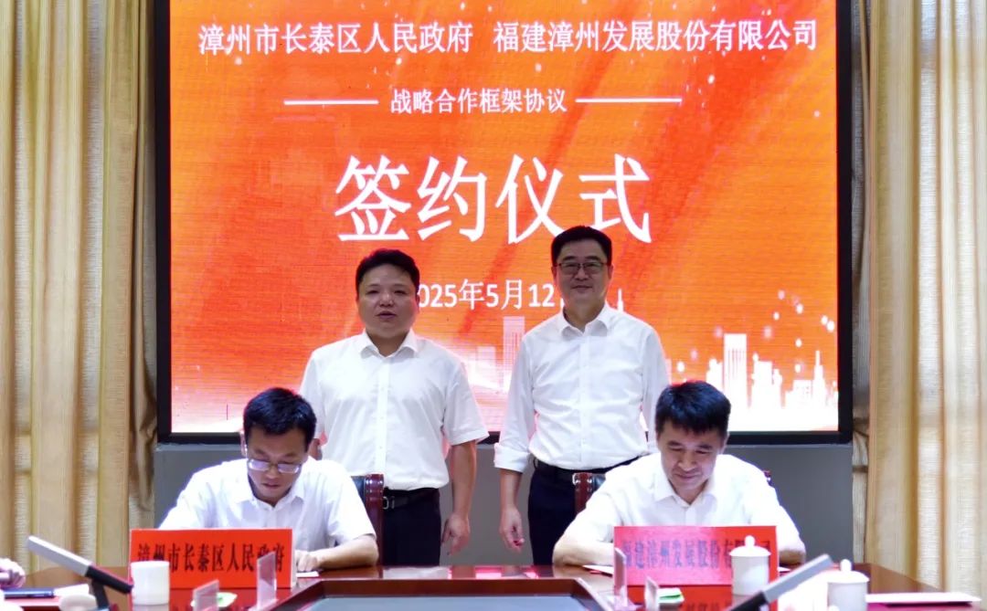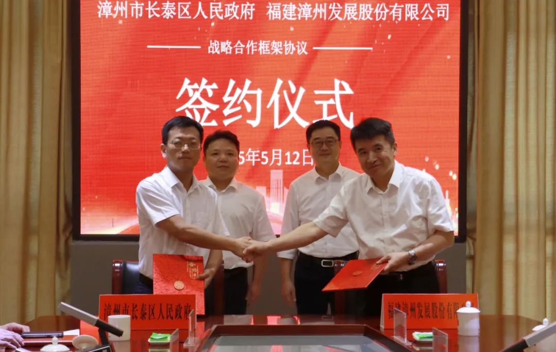 5月12日上午,漳州发展与漳州市长泰区人民政府举行战略合作框架协议签约仪式。长泰区委副书记、代理区长吴子毅,漳州发展党委书记、董事长陈毅建,长泰区委常委、区政府副区长蔡艺武,漳州发展副总经理、信产集团董事长、总经理罗进章,副总经理、漳发新能源董事长陈鸿辉,副总经理、董事会秘书李勤以及区直有关单位、公司有关部门主要负责人参加。