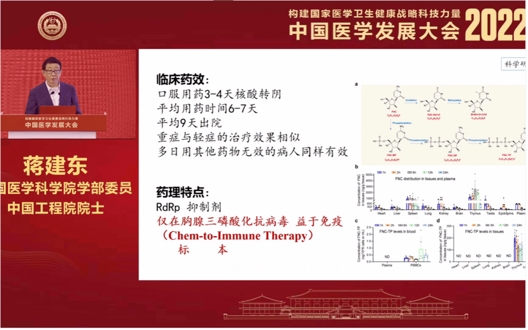 在2022年4月16日举行的中国医学发展大会上,中国医学科学院学部委员、中国工程院院士蒋建东重点报告了阿兹夫定在治疗新冠适应症上的研发情况和进展。据蒋建东院士介绍,患者口服阿兹夫定后3-4天核酸转阴,平均用药时间6-7天,平均9天出院。