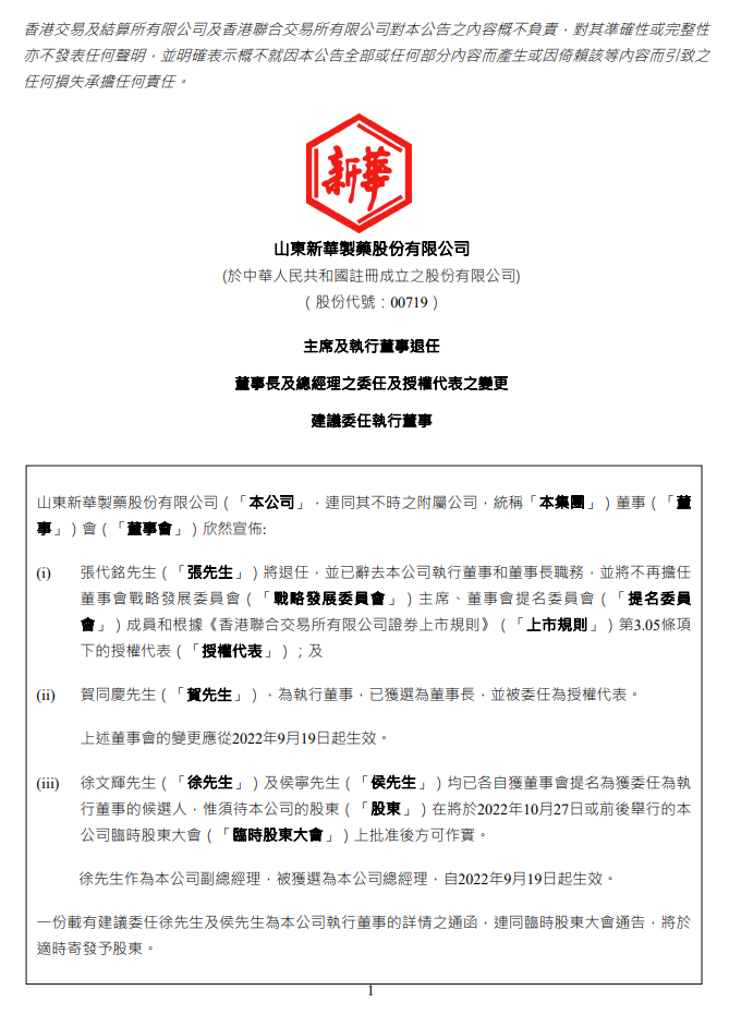 昨日,新华制药宣布,原公司董事长张代铭辞去董事长以及公司其他职务,董事长职务由公司原董事副总经理贺同庆接任。同时,徐文辉被聘任为公司总经理。