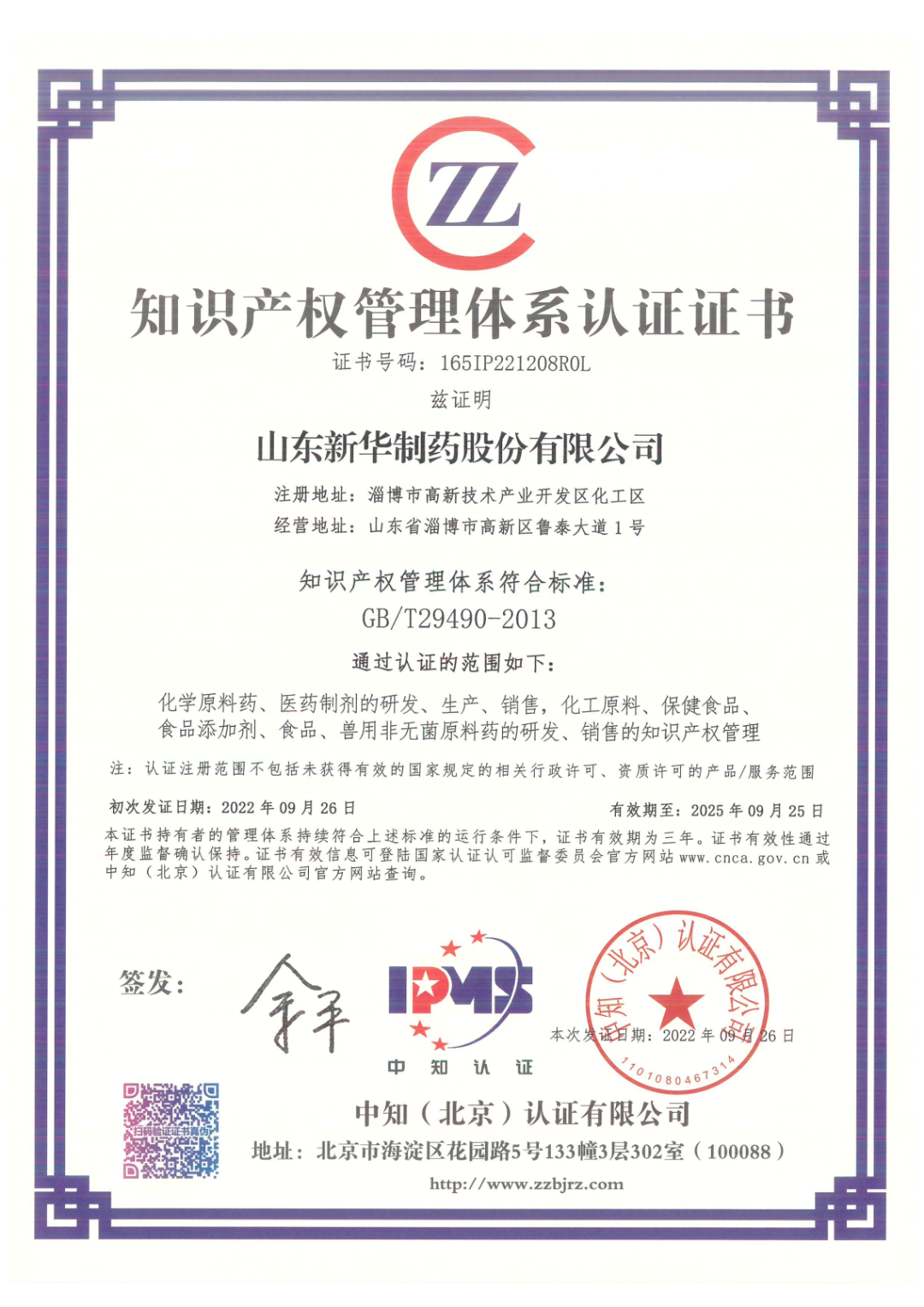 近日,新华制药取得了国家知识产权管理体系认证证书,标志着公司的知识产权管理水平迈上了新台阶。