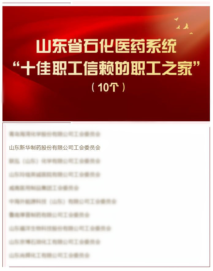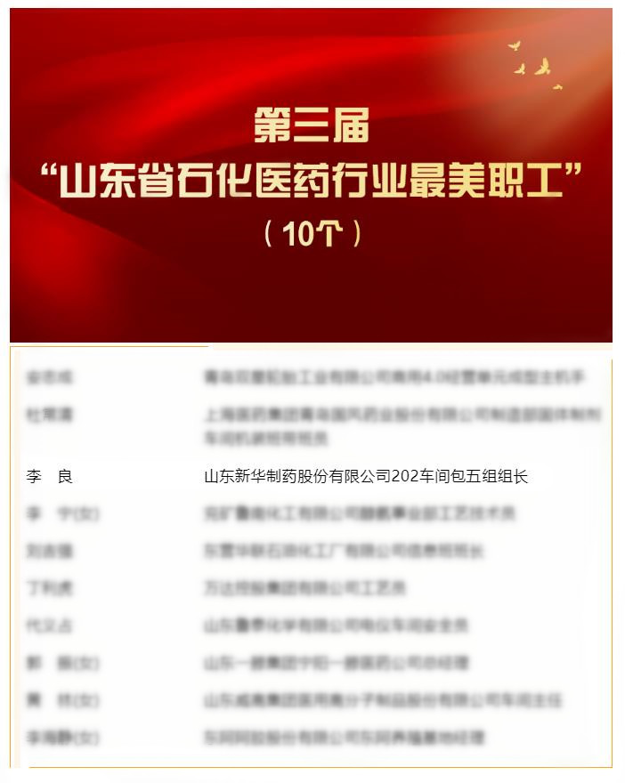 近日,省石油化学工会公布了“十佳职工信赖的职工之家十佳职工信赖的娘家人”及第三届“山东省石化医药行业最美职工”两项活动获奖名单。山东新华制药股份有限公司工会委员会喜获全省石化医药系统“十佳职工信赖的职工之家”称号,202车间包五组组长李良获评第三届“山东省石化医药行业最美职工”。