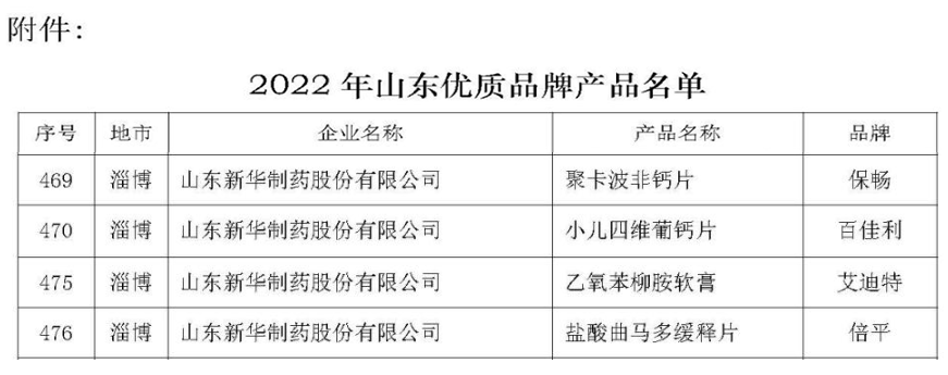 近日,山东省质量评价协会发布了《关于2022年山东优质品牌产品认定结果的通知》,新华制药保畅、百佳利、艾迪特、倍平等四个产品获评山东优质品牌产品。