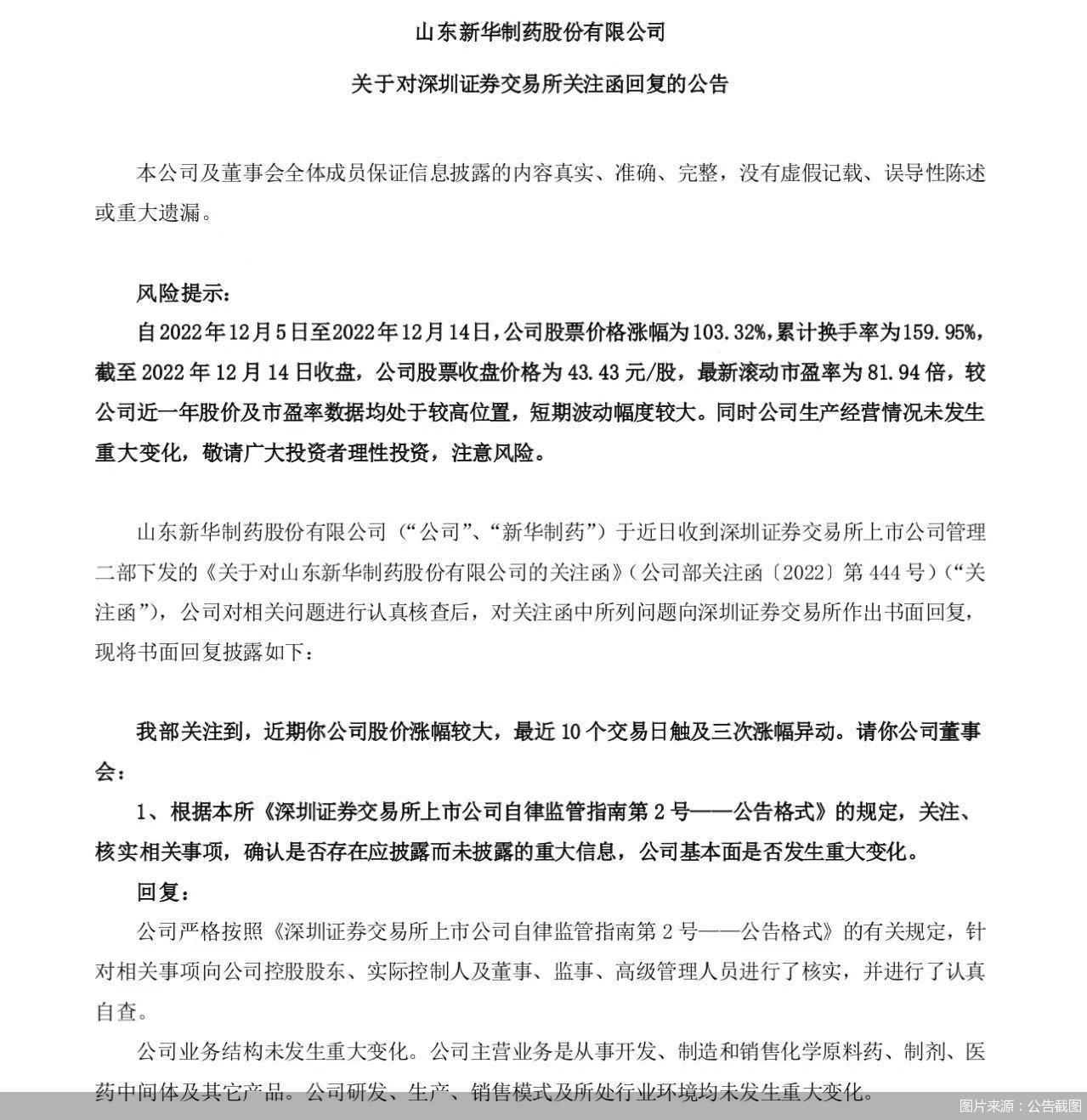 针对12月20日逼近跌停一事,新华制药证券部相关人士向北京商报记者表示,公司无应披露而未披露重大信息。股价涨涨跌跌是很正常的市场情况,公司的信息以巨潮资讯网等官方披露为准。