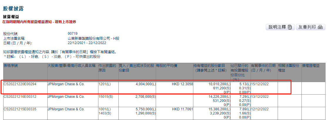 2022年12月22日,据港交所最新股权披露,山东新华制药股份(00719.HK)于2022年12月15日遭JPMorganChaseCo.(小摩)减持400.4万股H股,每股平均价12.31港元,涉资4927.24万港元。