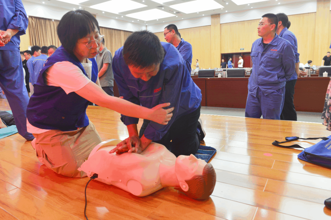 本次培训范围不仅包括公司应急救援队伍成员、各单位值班员及应急人员,还增加了各单位危险工艺、重大危险源的班组长、子公司的相关人员。培训内容包括触电人员的现场处置(心肺复苏、自动除颤仪 AED);机械伤害的现场处置(断肢、骨折、动脉划伤);化学灼伤和热烫伤;中暑人员的现场处置;中毒人员的现场处置等内容。