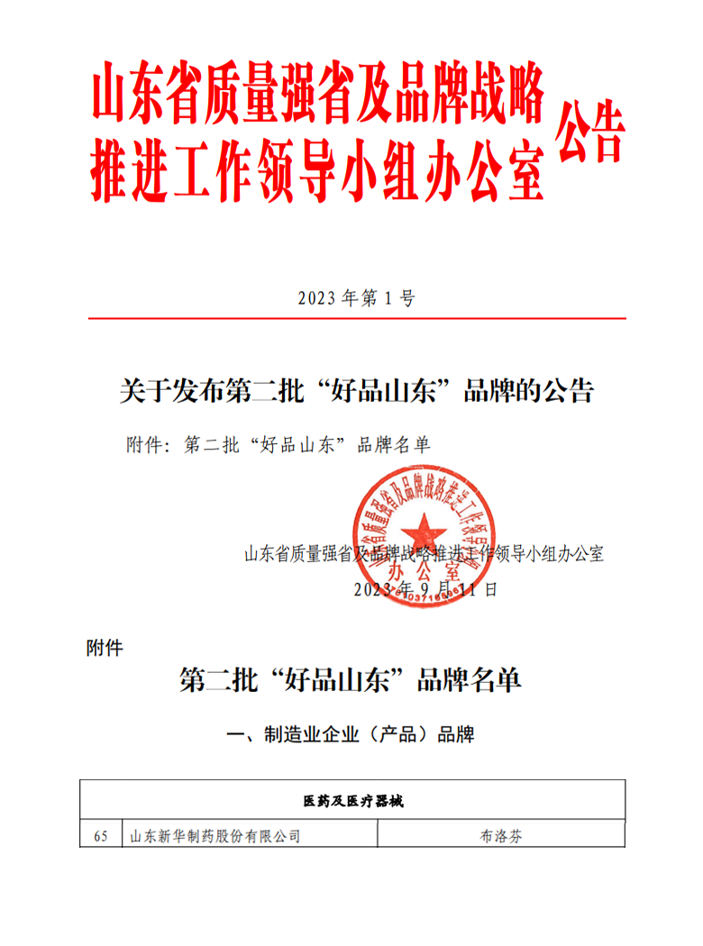 9月12日,由山东省市场监督管理局会同省委宣传部、省发展改革委、淄博市政府共同主办的山东省2023年“质量月”启动仪式在淄博举行。活动发布了第二批“好品山东”品牌名单,新华制药布洛芬成功入选。