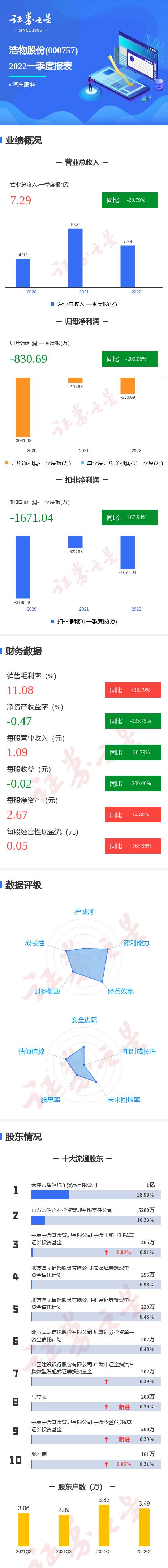 浩物股份2022一季报显示,公司主营收入7.3亿元,同比下降28.79%;归母净利润-830.7万元,同比下降200.06%;扣非净利润-1671.04万元,同比下降167.94%;其中2022年第一季度,公司单季度主营收入7.3亿元,同比下降28.79%;单季度归母净利润-830.7万元,同比下降200.06%;单季度扣非净利润-1671.04万元,同比下降167.94%;负债率38.03%,投资收益-57.34万元,财务费用479.88万元,毛利率11.08%。