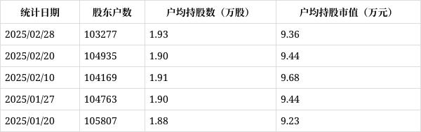 从3月4日公开信息显示,中色股份截至2025年2月28日公司股东户数为10.33万户,较上期(2025年2月20日)减少1658户,降幅为1.58%,变化不大。