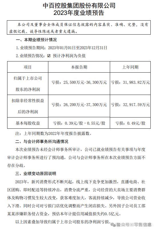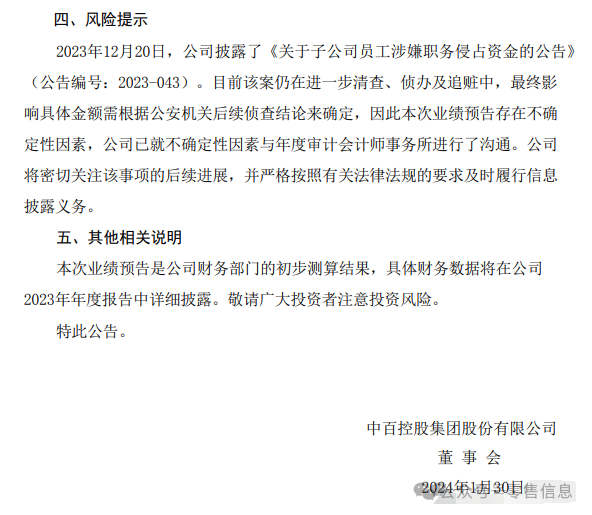 1月30日,中百集团官网发布《2023年度业绩预告》。