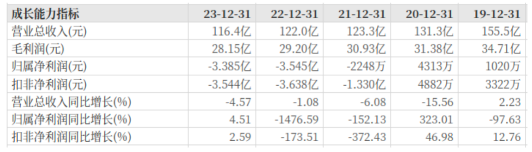 2023年,中百集团营收116.4亿元,同比减少4.57%,净利润亏损3.39亿元,扣非净利润亏损3.54亿元。